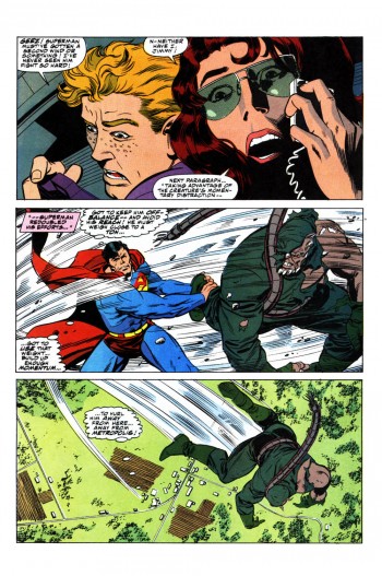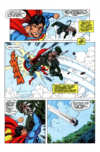 Ever the fan of the slow build-up, DC didn’t have Superman and Doomsday appear on the same panel until the third issue in the story – Superman #74: Countdown to Doomsday! This issue was written and drawn by Dan Jurgens, who had most of the creative duties for the whole story, writing and drawing three out of the seven comics. He’s got the first panel, with Superman taking a punch in the gut from the still mostly jail-suited Doomsday – you know, the blah version that was tier one reward for hitting the subscription minimum but not blowing it out of the water. Why, they look almost the same size there.