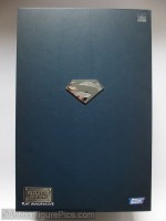 The packaging is elegant and simple, with a reflective S crest affixed to a matte, textured box. Lifting the lid, you’ll see a cardboard backdrop of the Metropolis skyline folded into three parts. The backdrop looks okay but the art isn’t quite detailed enough, this Metropolis having a bit of a “colouring book” feel to it. Beneath that, you’ll see the two capes (more on that later) and a tray housing the figure along with the alternate hands and heads, plus a few more extras. Beneath that tray are the components of two display bases, one made to look like a chunk of the Fortress of Solitude and another more traditional base with an attachable segmented stand.