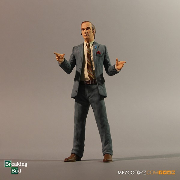 Mezco has announced two more exclusives for San Diego Comic-Con 2015 – a pair of Breaking Bad figures. Saul Goodman gets a repaint and his packaging will serve as a diorama of his office – gotta love those Corinthian columns and the U.S. Constitution mural! Walter White, aka Heisenberg, gets the 12-inch treatment with a new deco – a black jacket and blue shirt. Heisenberg features a removable hat and interchangeable glasses and sunglasses.