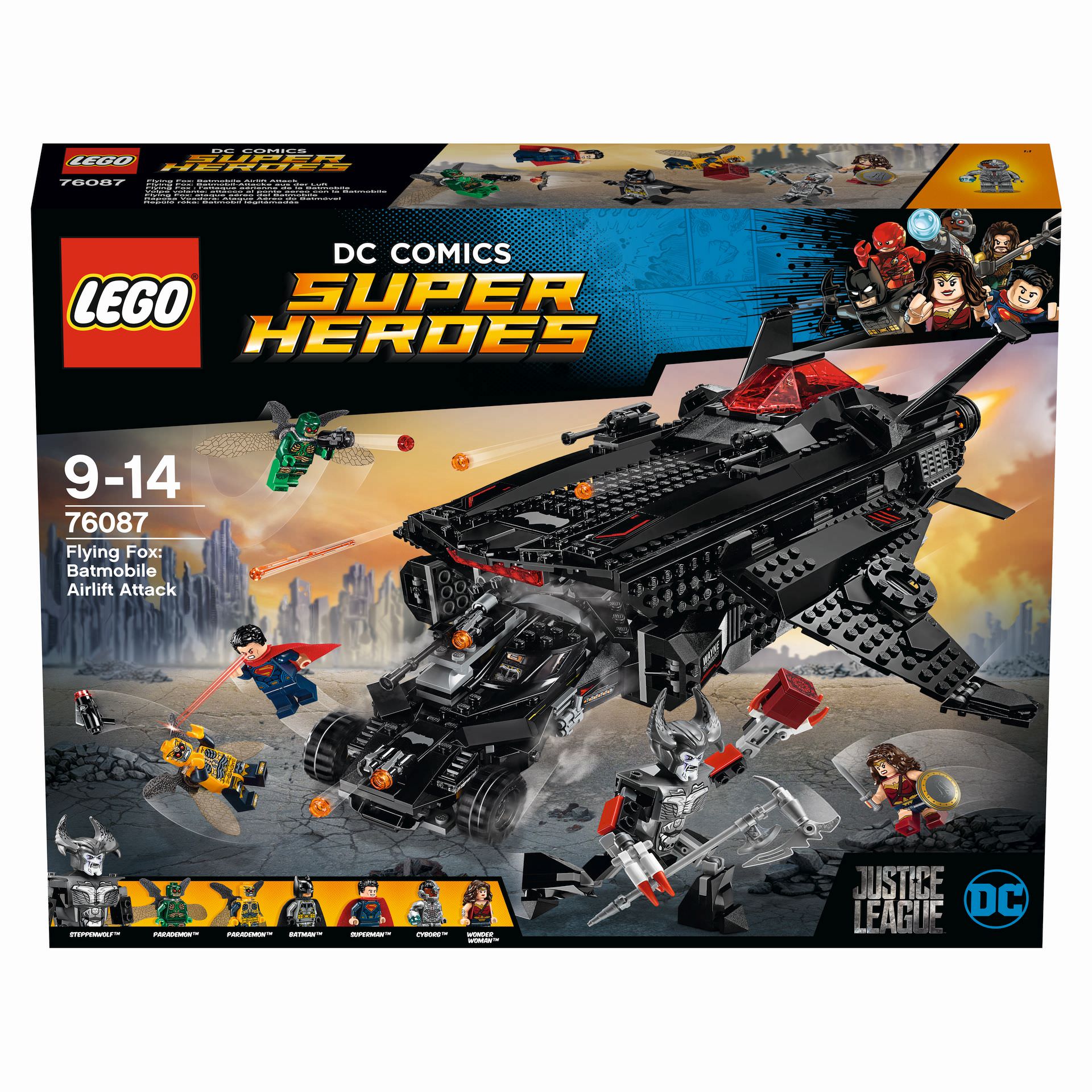 Team up with the Justice League against Steppenwolf™ and the Parademons to claim the precious Mother Box, in this exciting LEGO® DC Comics Super Heroes Flying Fox: Batmobile Airlift Attack set. The Flying Fox features a 2-minifigure cockpit with a lift-off canopy, 2 spring-loaded shooters, 2 stud shooters and space inside for the Batmobile with an opening cockpit, 3 stud shooters and adjustable wings. Includes 6 minifigures with weapons—including Cyborg’s attachable stud-shooting arm—plus a Steppenwolf big figure.