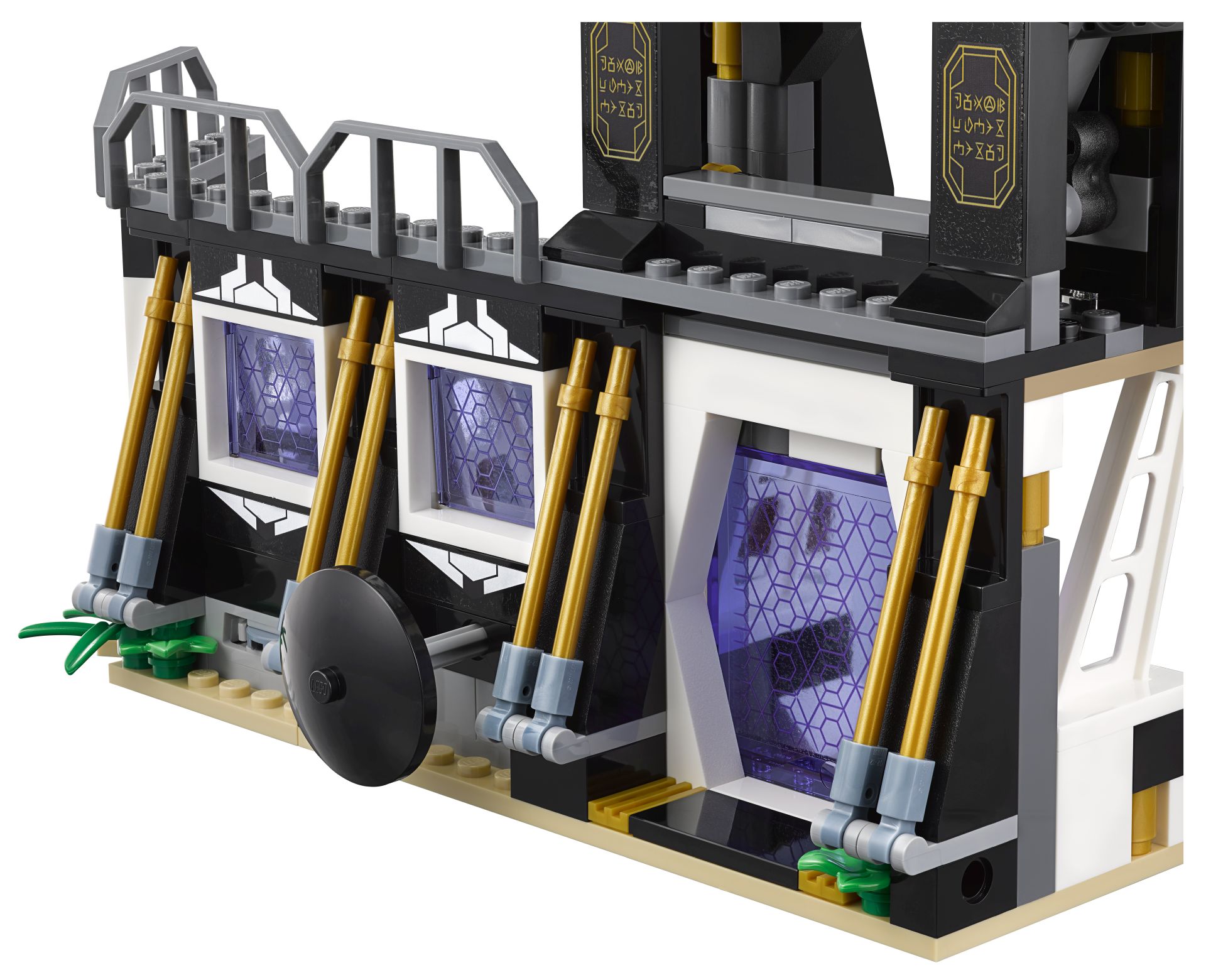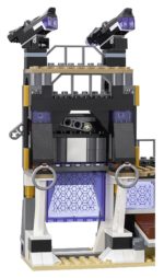 - Wakandan wall features a lever-operated opening gate, tower with 2 rotating, dual stud-shooting turrets, hidden disc shooter, hinged wall section, Wakandan lab with minifigure seat, desk and 2 computer screen elements, flip function and the Infinity Stone element.